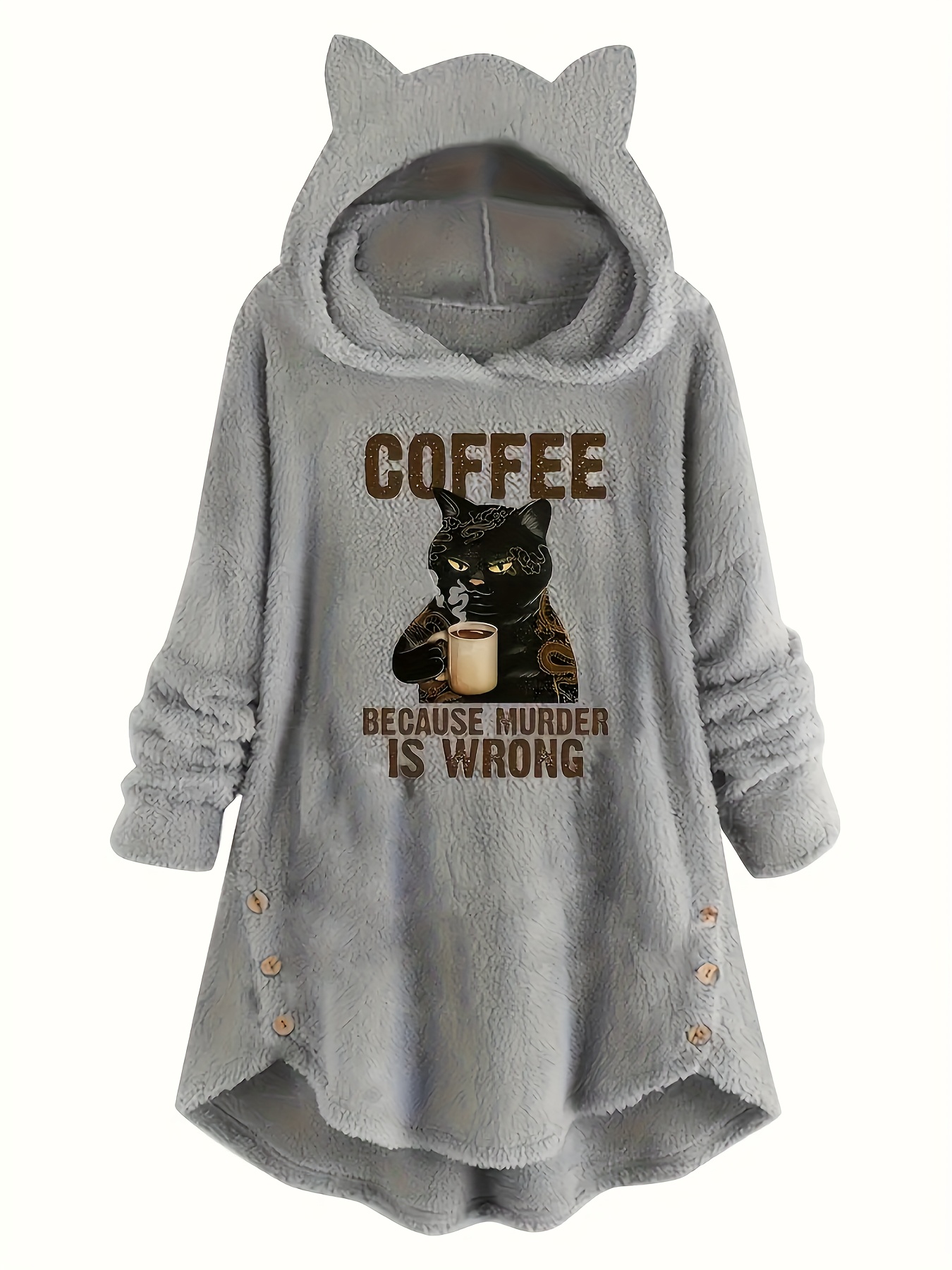 Plus Size - Women'S Plus Size Casual Teddy Hoodie with Cat Ears and Button Details | Long Sleeve, Asymmetrical Hem, Fall/Winter, Animal Print, Pullover Style