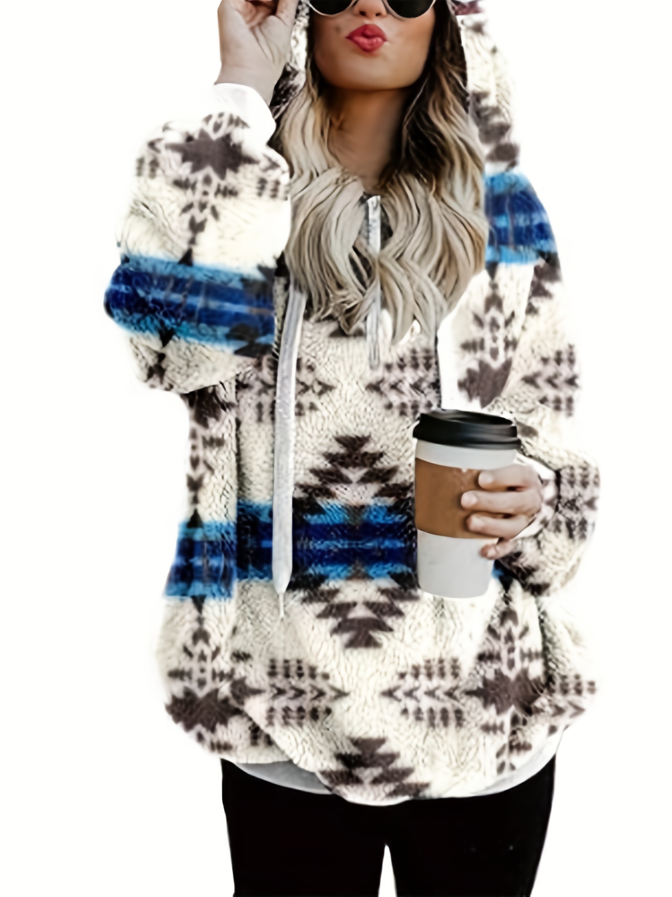 Plus Size Boho Chic Hoodie - Stylish Aztec Print with Cozy Plush, Half-Zipper Closure, Drawstring Hood & Handy Pockets - Perfect for Winter Wear