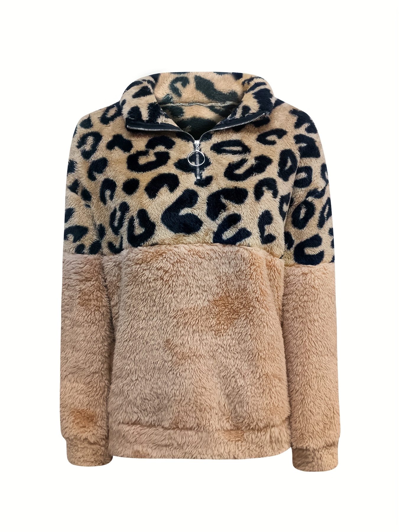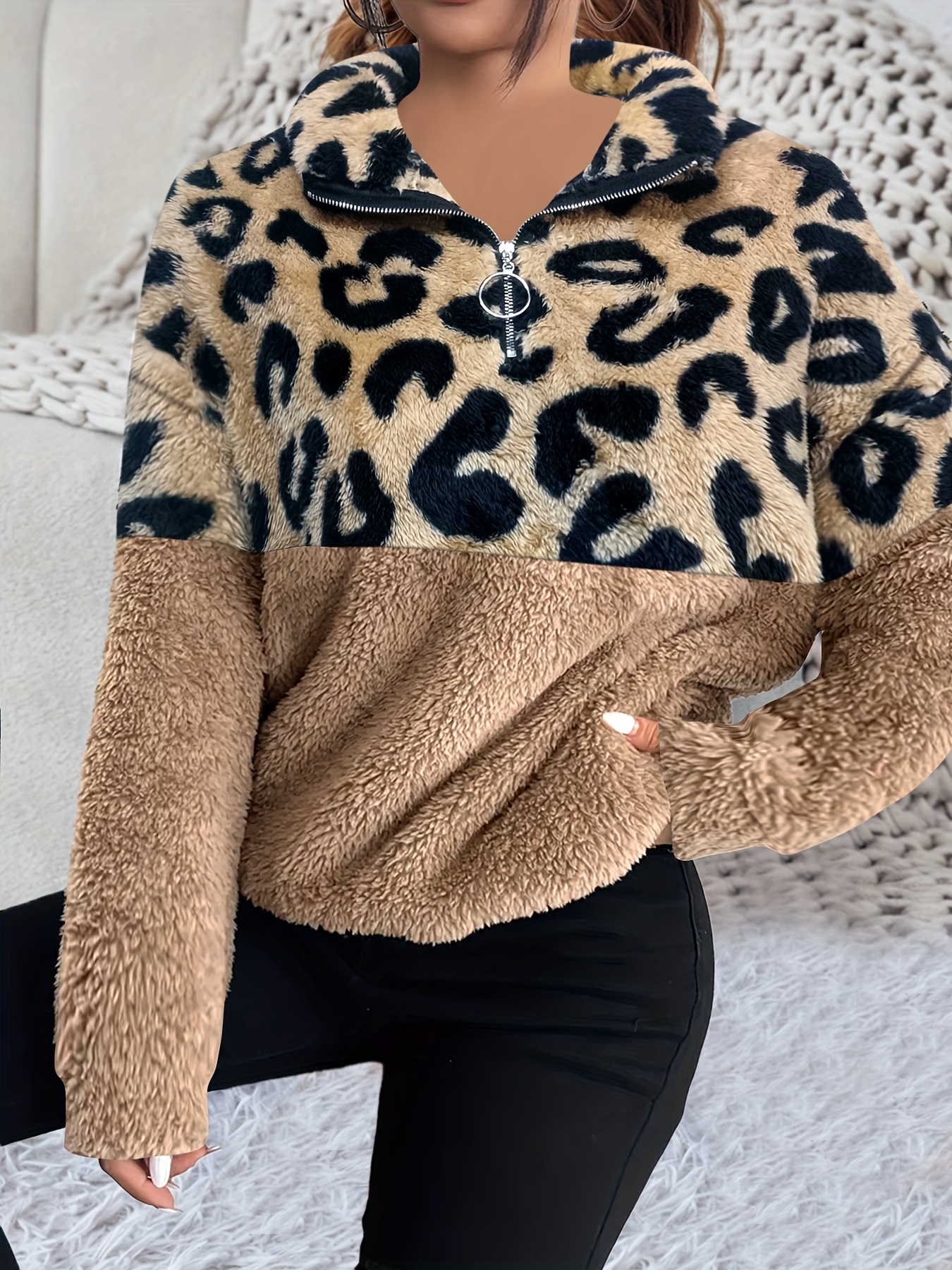 Plus Size, Winter Women's Fashion Double-Sided Polar Velvet Top with Leopard Print Long Sleeve Hoodie, Contrast Color Zipper Loose Casual Plus Size Pullover