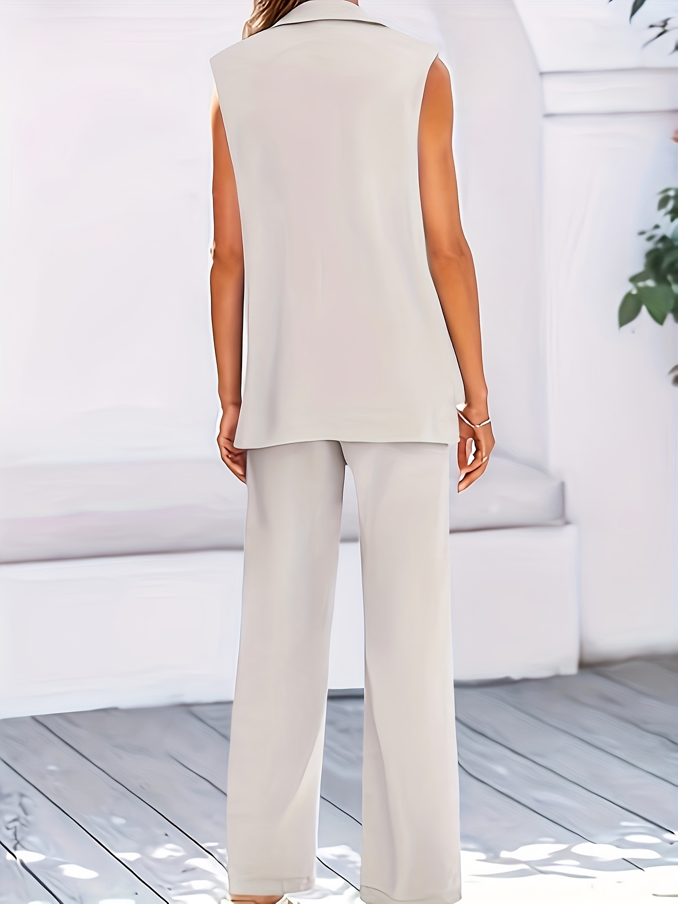 Stylish Plus Size Solid Color Elegant Suit Set - Women's Plus Size Clothing, Button Sleeveless Vest & Straight Leg Loose Pants for Work or Formal Occasions - Comfortable, Breathable, and Flattering