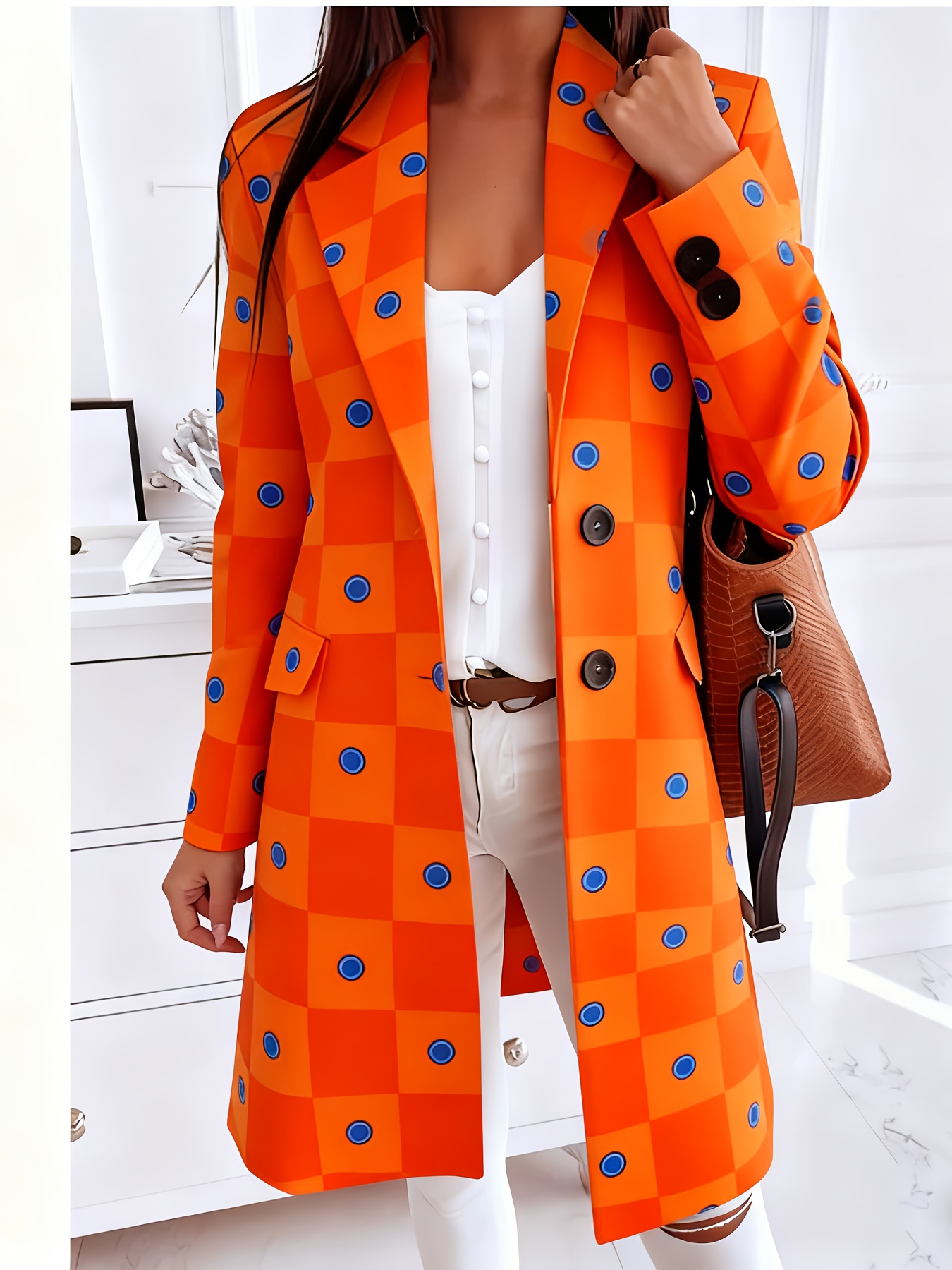 Plus-Size Women'S Winter Warm Collared Button- Long-Sleeve Coat Jacket with Navy & Plaid Print, Golden-Tone Lapel Collar & Chest Pocket - Casual to Semi-Formal Outerwear for Autumn & Winter, Durable Easy-Care Fabric (No Shrinkage) - Versatile Everyd