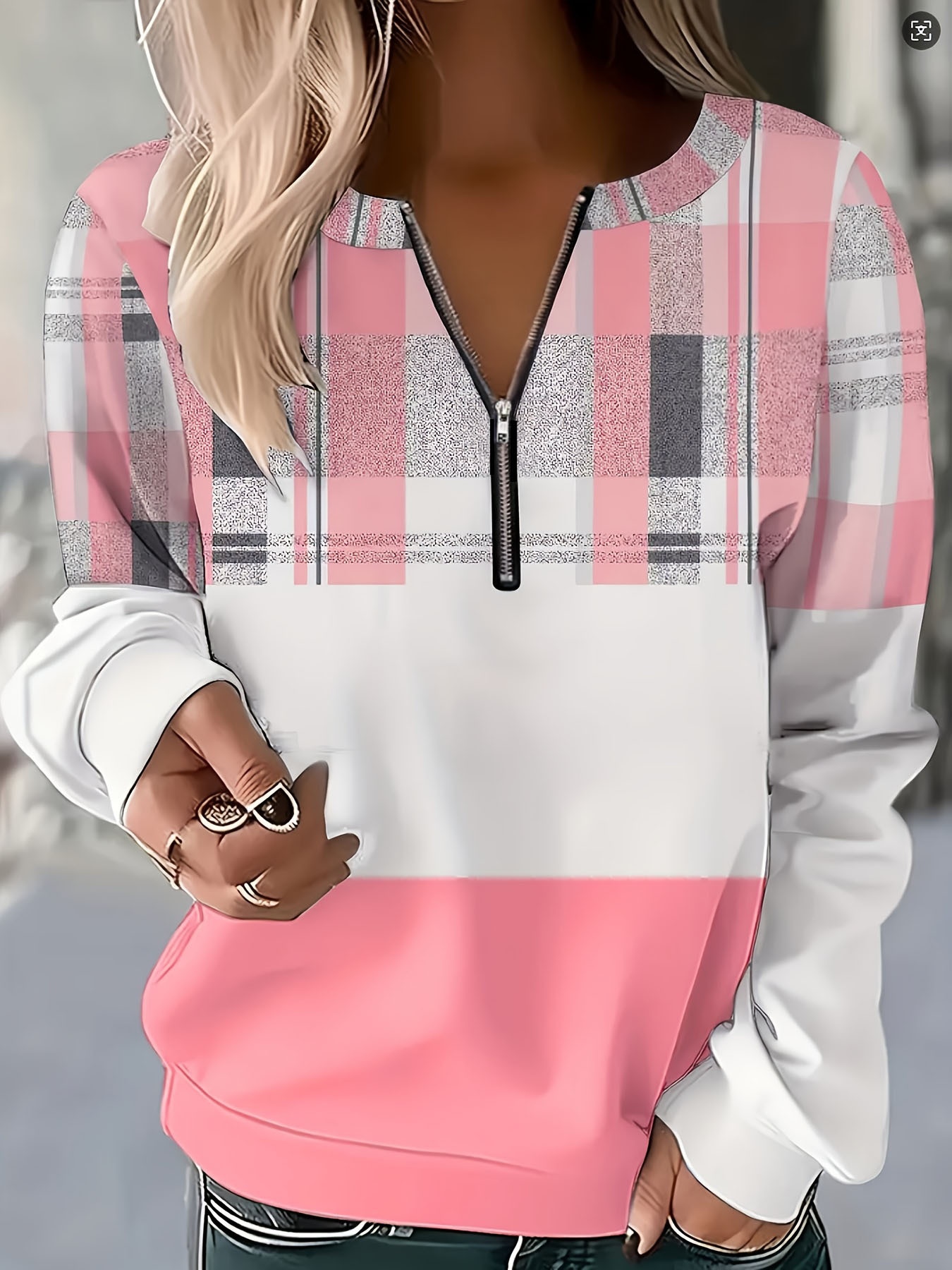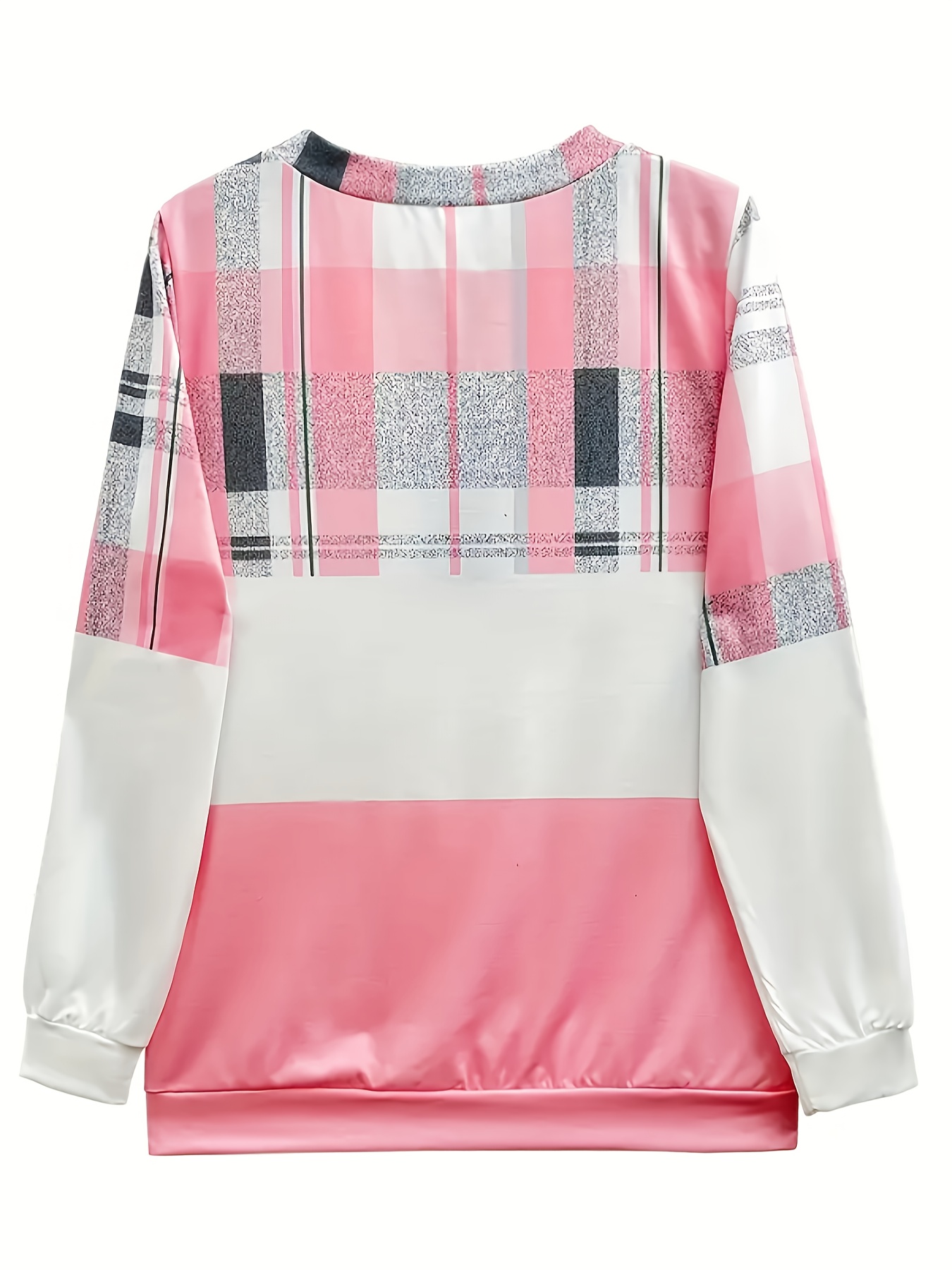 Plus Size, Plus Size Women's Casual Plaid Print Zip-Up Sweatshirt - Round Neck Long Sleeve Two-Tone Color Block (Pink & White) with Zipper Detail, Machine Washable All-Season Comfort