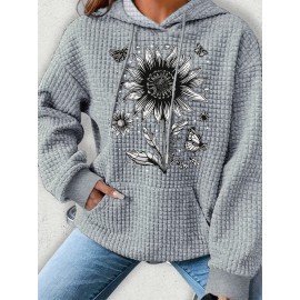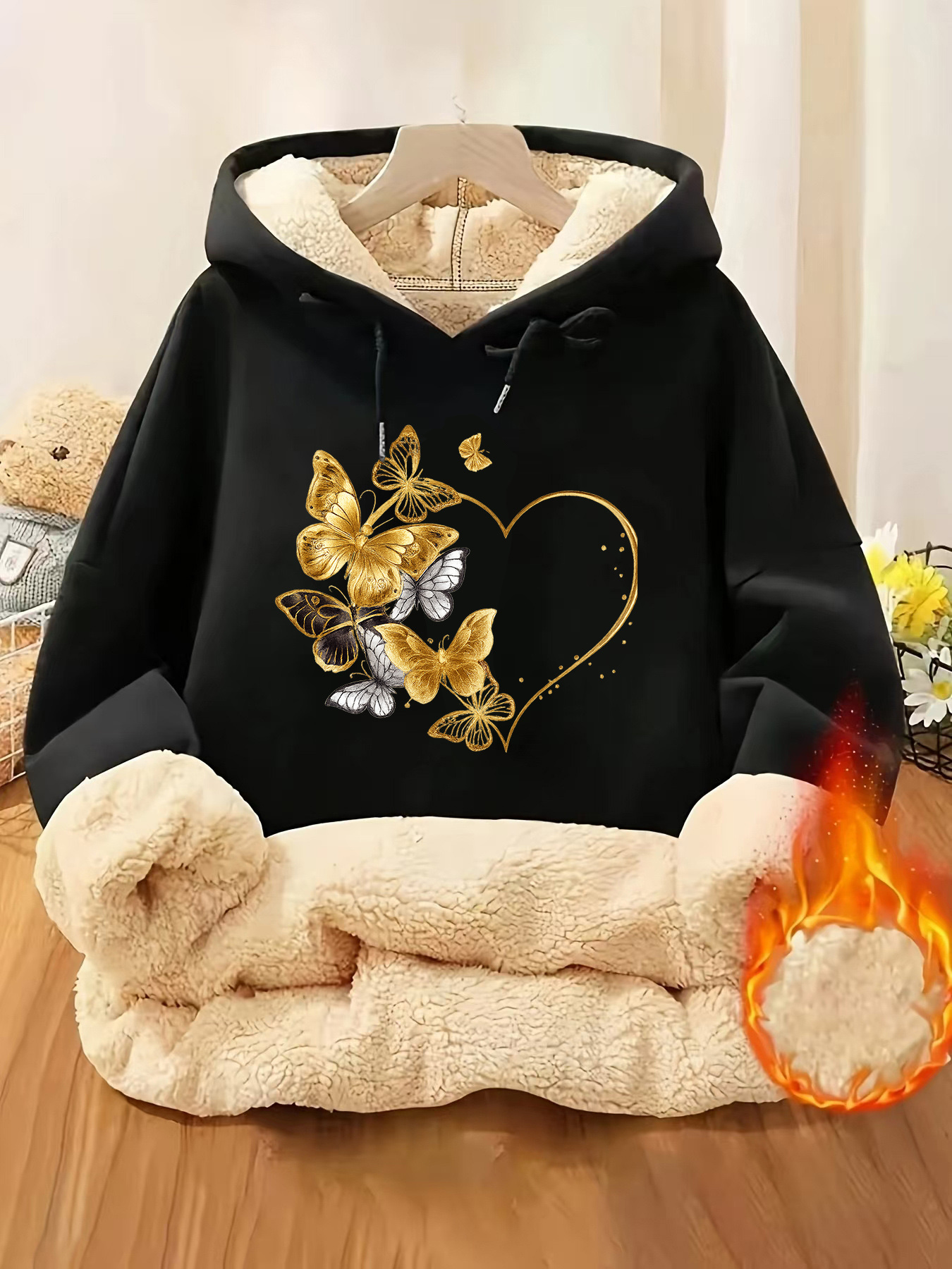 Plus Size - Women'S Cozy Thickened Llama Hoodie - Black with Golden Butterfly & Heart Design, Long Sleeve Pullover with Kangaroo Pocket, Casual Fall/Winter Wear, Cozy Clothing | Butterfly Heart Design | Kangaroo Pocket Hoodie, Cute Hoodie