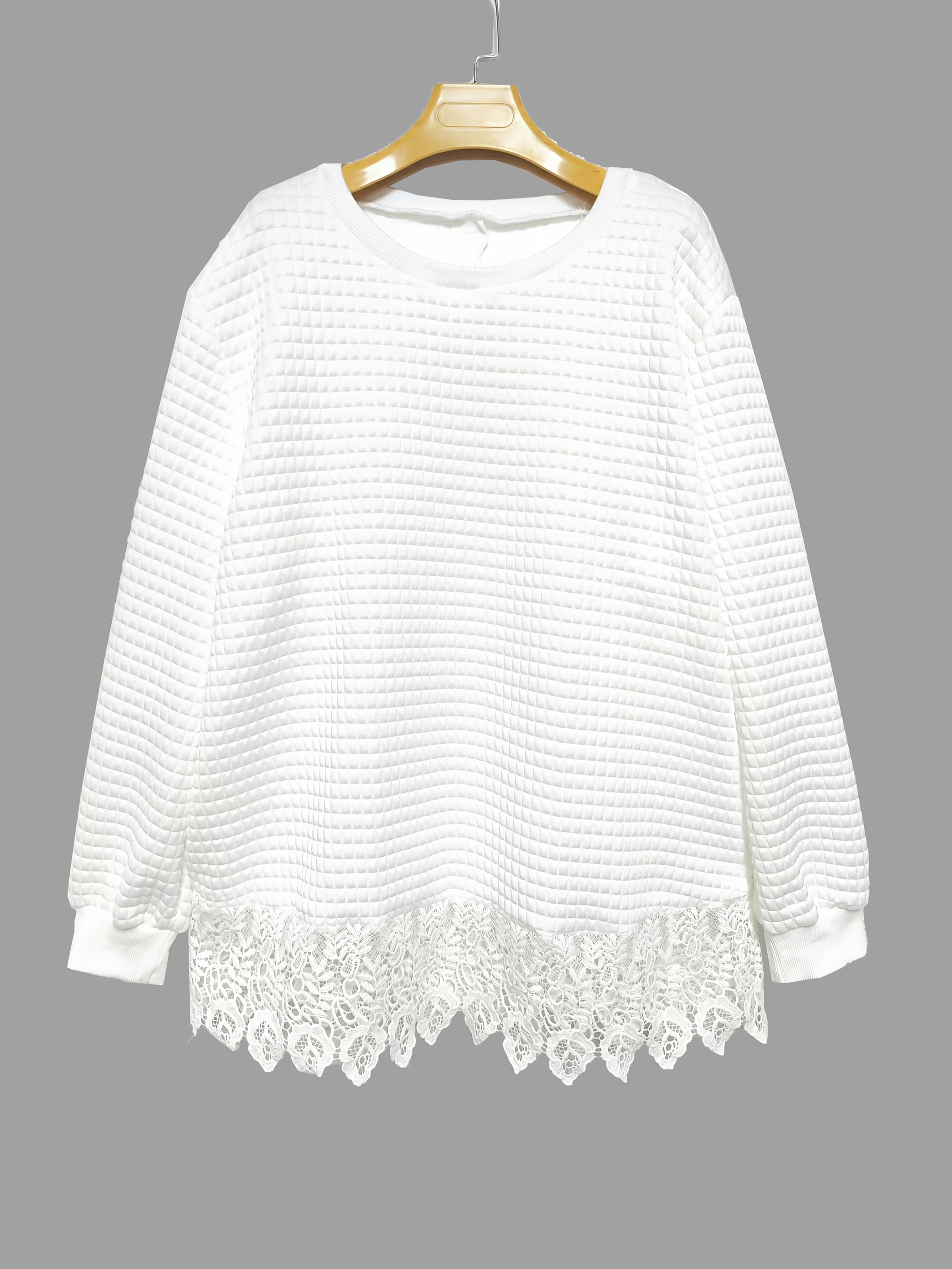 Plus Size, Women's Elegant Long Sleeve Pullover Sweatshirt - White with Lace Trim, Relaxed Fit for Everyday & Formal Events, Machine Washable Winter Sweater for Women, Cute Sweatshirts, Autumn Fashion, Classic Round Neckline, Quality Stitching, Stylish Clothing, Casual Chic