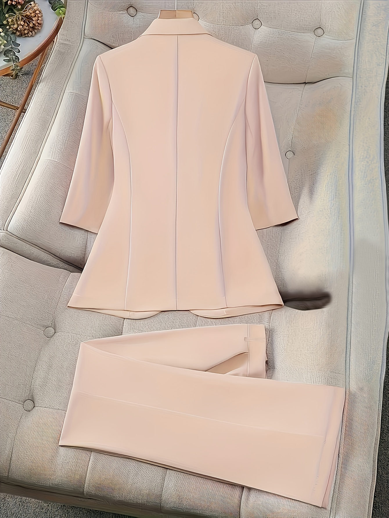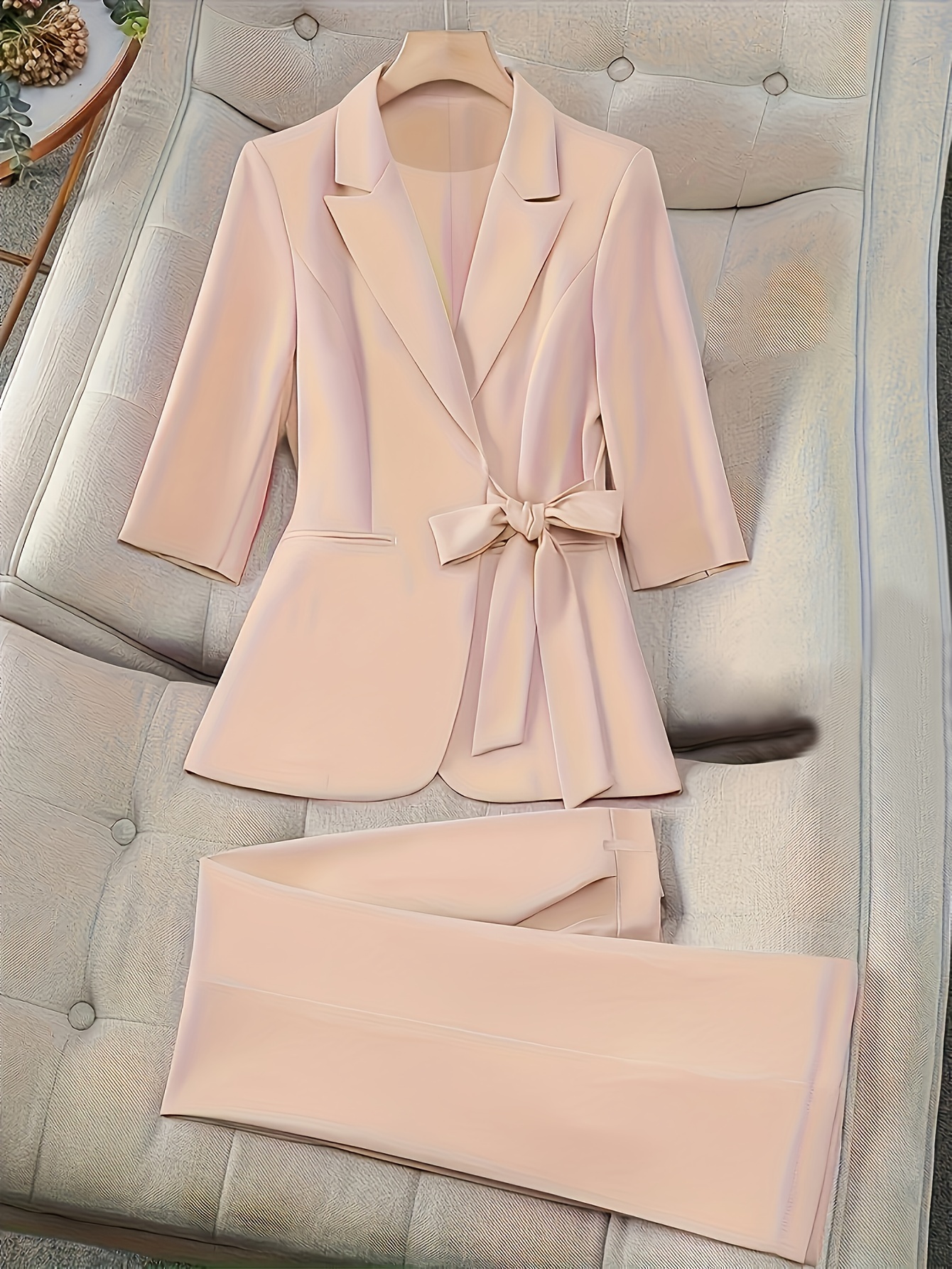 Elegant Office Suit Set for Women - Solid Color Polyester Blazer with Front Bow Detail and 3/4 Sleeves, Matching Trousers - Non-Stretch Woven Fabric, Suit Collar, Autumn/Winter Collection
