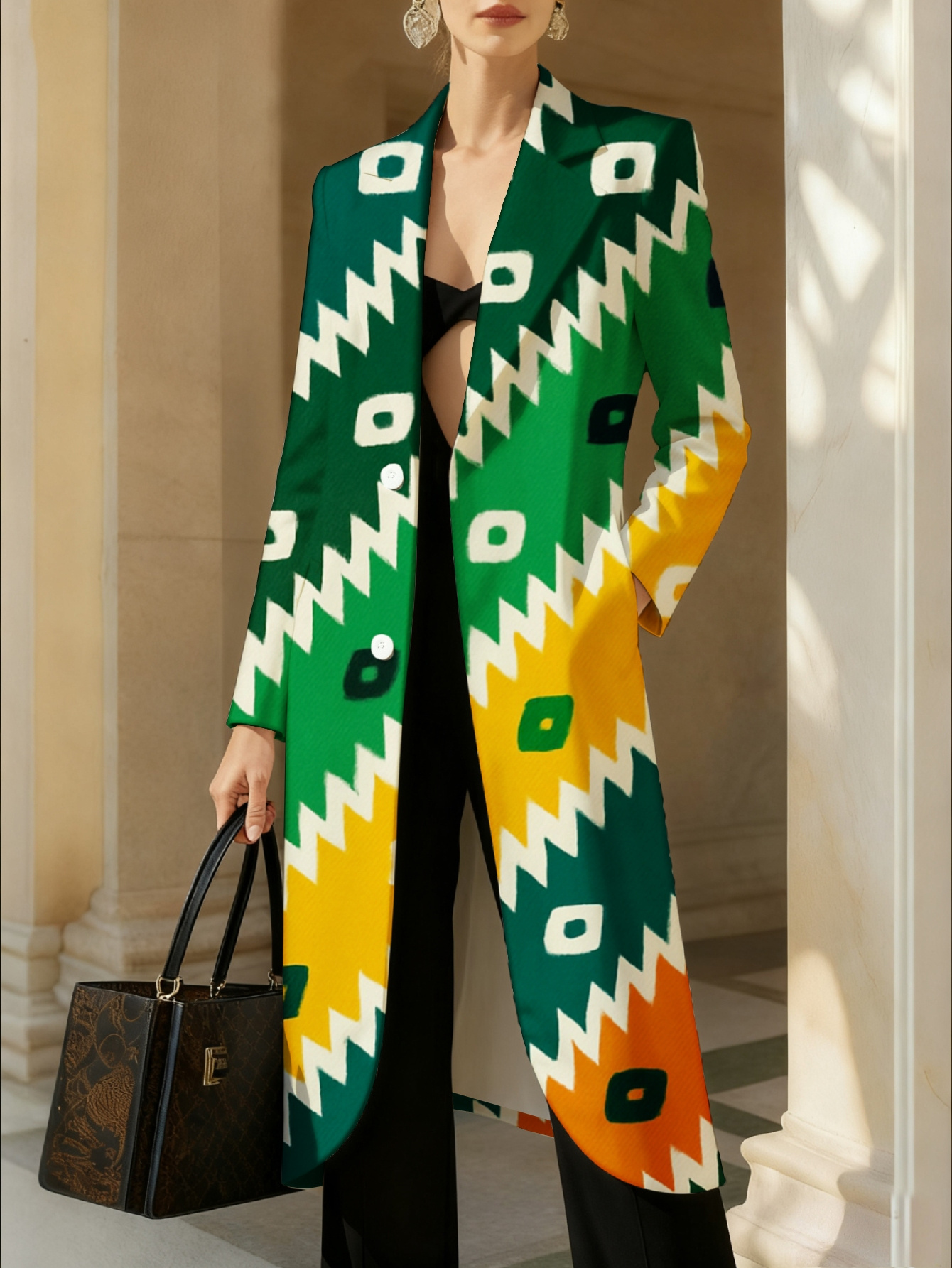 Plus Size - Women'S Structured Loose-Fit Blazer Coat with Green Yellow Orange Print - Belted Waist, All-Season Versatile Office Wedding Evening Jacket, Casual to Professional Outerwear for Women Professionals, Tailored Fit & Easy-Care Fabric