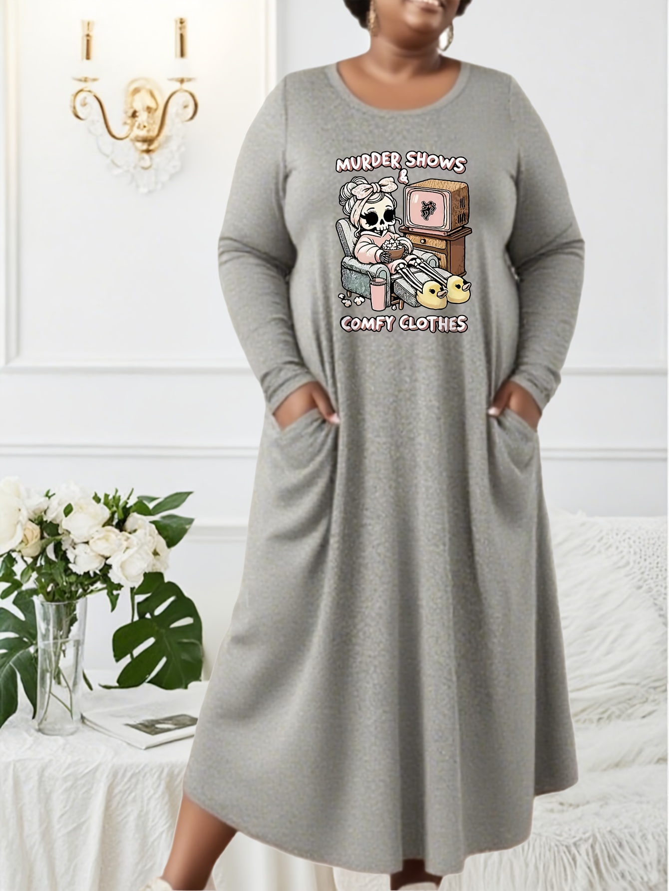 Women's Plus Size Murder Shows TV Show Graphic Dress - Cozy Long Sleeve Maxi Dress with Pocket, Crime Scene Tape Print & TV Character Design, Machine Washable Casual Winter Outfit for Fans, Loose Fit Round Neck H-Line Silhouette with Murder Mystery Theme, Autumn/Winter Wear, Relaxed Fit for Everyday Comfort, Comfortable Fabric, Durable Material