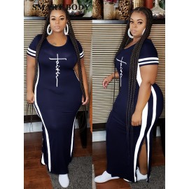 Faith Letter Women'S Striped Printed Casual Dress Side Slit Round Neck Short-sleeved Dress, Spring And Summer Casual WomenS Maxi Dress Striped Trim Split Thigh Longline Dress For Summer