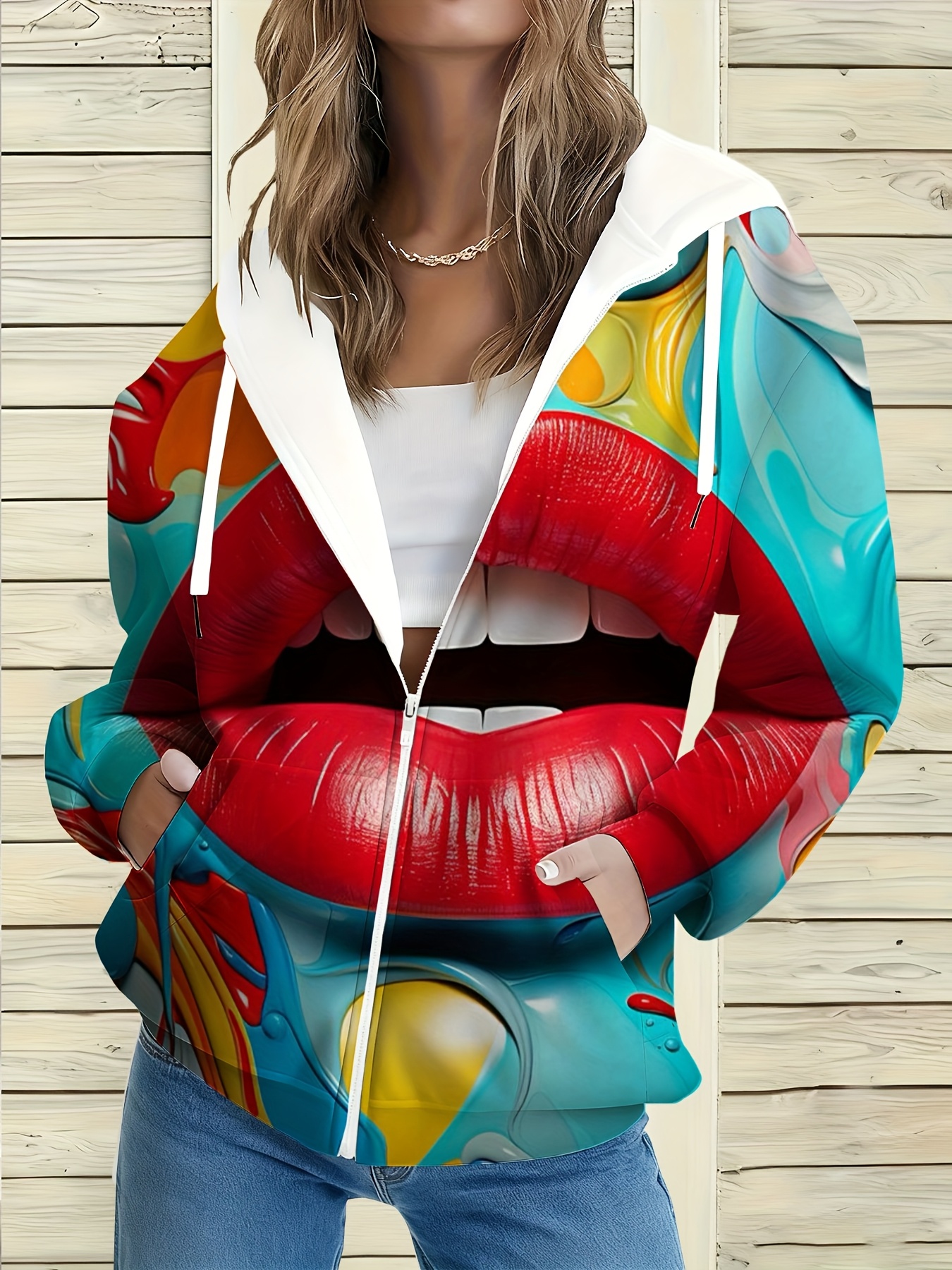 Women'S Plus Size 3D Lips Print Full-Zip Hooded Jacket - Red Lips & Multicolor Abstract Face Design, Warm Winter Coat for Art Parties, Daily Wear, Birthday Outfits - Statement-Making Lip for art Gift for Women (Friends & Family) - Casual to Formal O