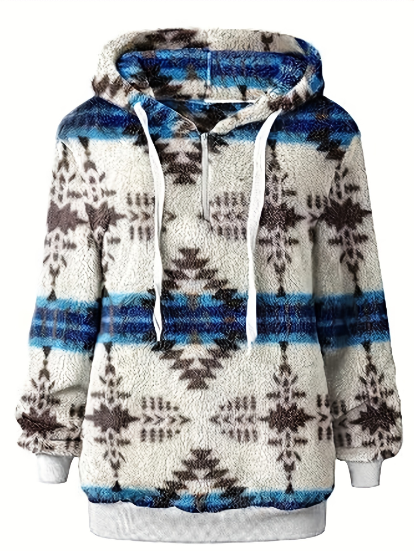 Plus Size Boho Chic Hoodie - Stylish Aztec Print with Cozy Plush, Half-Zipper Closure, Drawstring Hood & Handy Pockets - Perfect for Winter Wear
