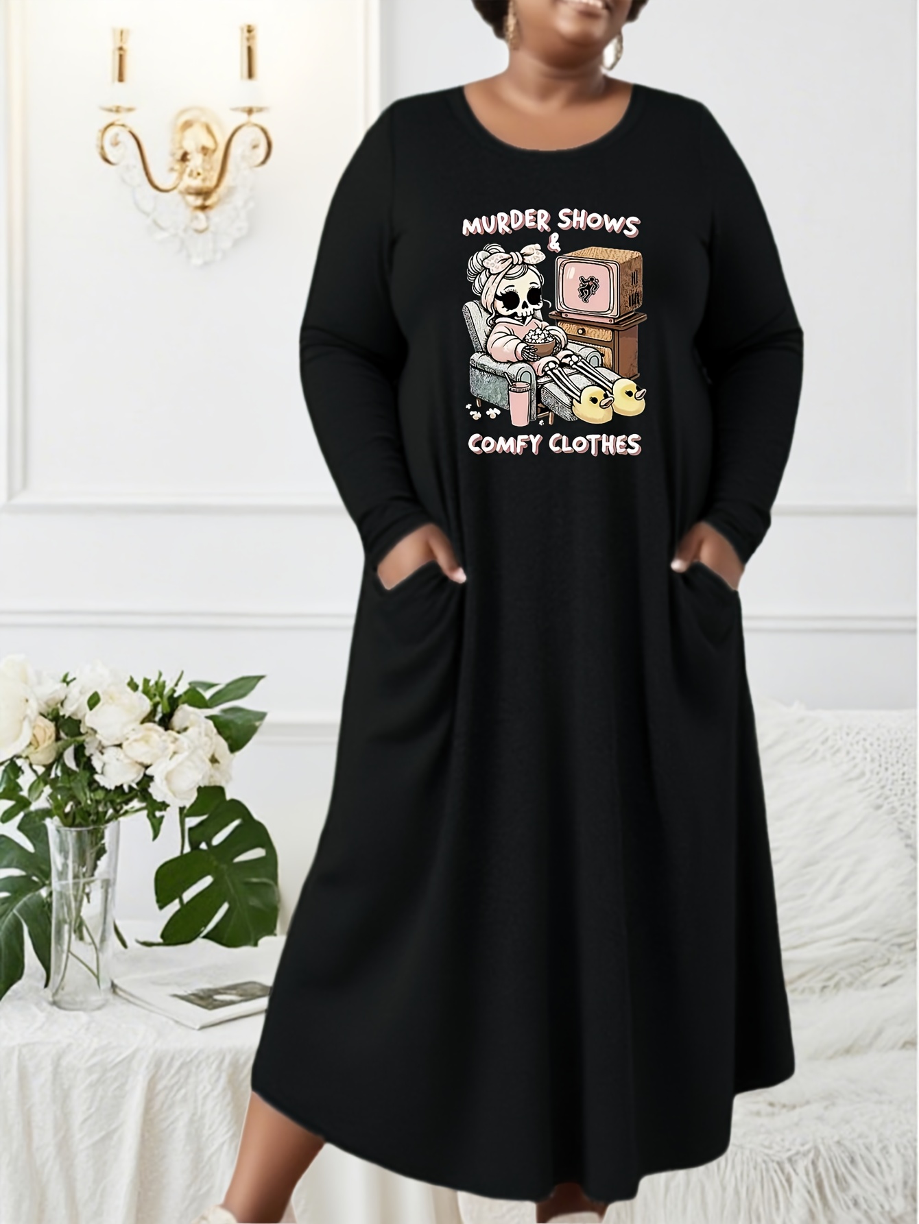 Women's Plus Size Murder Shows TV Show Graphic Dress - Cozy Long Sleeve Maxi Dress with Pocket, Crime Scene Tape Print & TV Character Design, Machine Washable Casual Winter Outfit for Fans, Loose Fit Round Neck H-Line Silhouette with Murder Mystery Theme, Autumn/Winter Wear, Relaxed Fit for Everyday Comfort, Comfortable Fabric, Durable Material